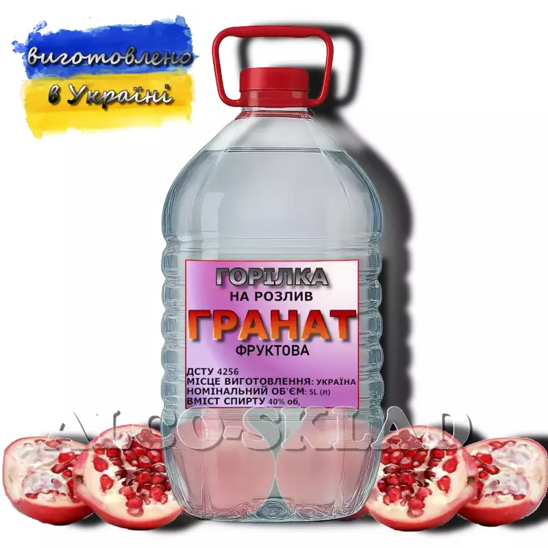 Фруктова горілка «Гранат» 40% — насичений смак граната та м’яке післясмак у зручній ПЕТ-пляшці 5 л з індикатором першого відкриття. Виробництво Україна, відповідає ДСТУ 4256:2021. Ідеально підходить для банкетів, барів і коктейлів. Доставка Новою поштою по всій Україні.