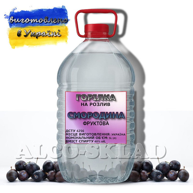 Фруктовая водка «Смородина» 40% в формате ПЭТ 5 л с пломбой первого вскрытия. Яркая ягодная ароматика чёрной смородины, лёгкая кислинка и чистое послевкусие. Производство — Украина, соответствует ДСТУ 4256:2021. Доставка Новой почтой по всей стране.